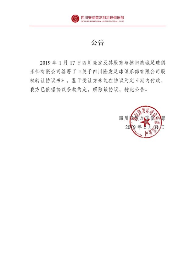 川足在公告中表示:“2019年1月17日四川隆发及其股东与德阳旌城足球俱乐部签署了《关于四川隆发足球俱乐部公司股权转让协议书》,鉴于受让方未能在协议约定日期内付款,我方已依据协议条款约定,解除该协议。”