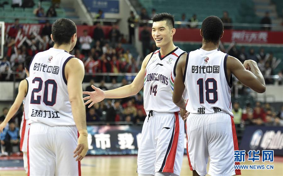 时代中国广州队球员郭凯(中)和队友击掌庆祝胜利。新华社记者梁旭摄