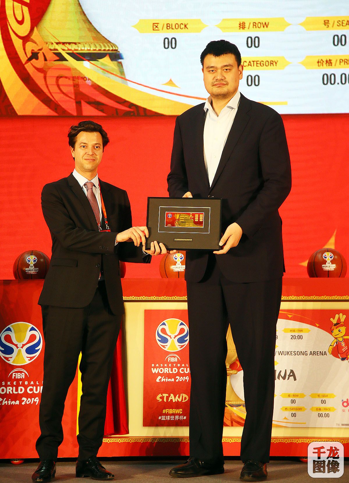 2月28日,2019年国际篮联篮球世界杯开启全球预售,32支球队套票9折官网首发。图为中国篮球协会主席姚明、和国际篮联市场部主任大卫·尼维尔交换礼物。千龙网记者 戚连民摄