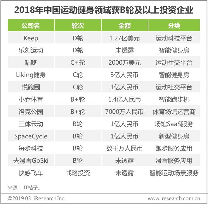 随着投资者的态度更加谨慎与落地,企业的盈利能力和长线经营潜力是更受关注的要素。2018年中国运动健身领域获B轮以上投资金额较高的12家企业中,从提供的服务类型来看,这些企业均涉及智能科技领域。获投金额最高的Keep作为运动科技平台,其用户体量、原生内容、科技感、社交元素、智能化等多方面属性,表现出的竞争力和发展空间受到投资者的青睐。