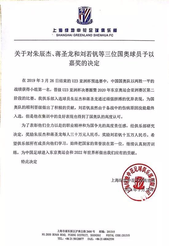 为了表彰他们全力以赴的职业精神和为国争光的高度责任感,经俱乐部研究决定,奖励朱辰杰和蒋圣龙每人三十万元人民币,奖励刘若钒十五万人民币。希望俱乐部所有成员向他们学习,始终把国家的荣誉放在第一位,继续认真刻苦训练,为中国足球进入东京奥运会和2022年世界杯做出我们应有的贡献。