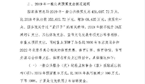 《预算》对国家体育总局2019年一般公共预算支出情况进行了说明。《预算》称:“国家体育总局2019年一般公共预算支出421097.72万元,比2018年执行数352662.72万元增加68435万元。按照党中央、国务院关于过‘紧日子’的有关精神,2019年按不低于5%压缩培训支出、其他体育支出、宣传文化发展专项支出等非刚性、非重点项目支出,同时重点保障了与备战2020年东京奥运会和2022年北京冬奥会相关的体育竞赛、体育训练、体育场馆、体育交流与合作等支出。”