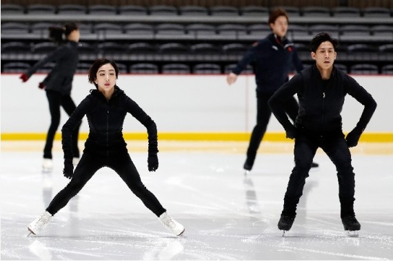 3月12日,花样滑冰双人滑选手隋文静(前左)/韩聪在训练中。新华社记者王丽莉摄