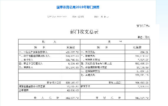 根据《预算》的内容,国家体育总局2019年收入预算约为94.25亿元,支出预算约为93.46亿元。