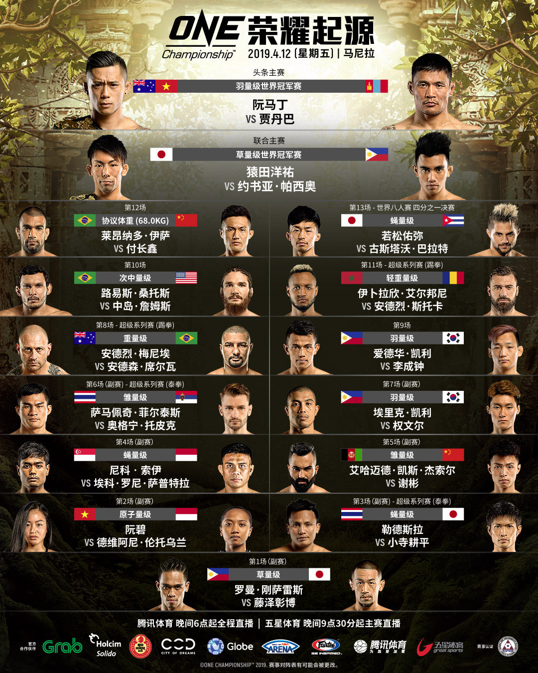 亚洲国际体育传媒公司ONE冠军赛将于4月12日周五在菲律宾首都马尼拉举办ONE:荣耀起源的大型格斗赛事。当晚将拥有两场综合格斗世界冠军战,分别是“蒙古战神”贾丹巴(Narantungalag Jadambaa)挑战羽量级卫冕冠军阮·马丁(Martin Nguyen),菲律宾新贵“激情”约书亚·帕西奥(Joshua Pacio)丢掉冠军头衔后,再度迎战日本草量级新王猿田洋祐(Yosuke Saruta)。除此之外,赛前还有更多看点与拳迷们一同分享。