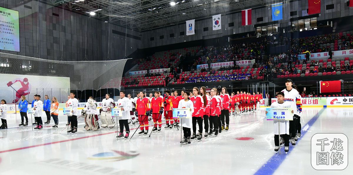 4月6日,2019年国际冰联女子冰球世界锦标赛甲级B组赛事在北京首钢冰球馆拉开帷幕,中国队在揭幕战中以3比0完胜拉脱维亚队,来自北京的鲁双为中国队打进两粒进球。图为开幕式。千龙网发 北京市体育局新闻中心供图
