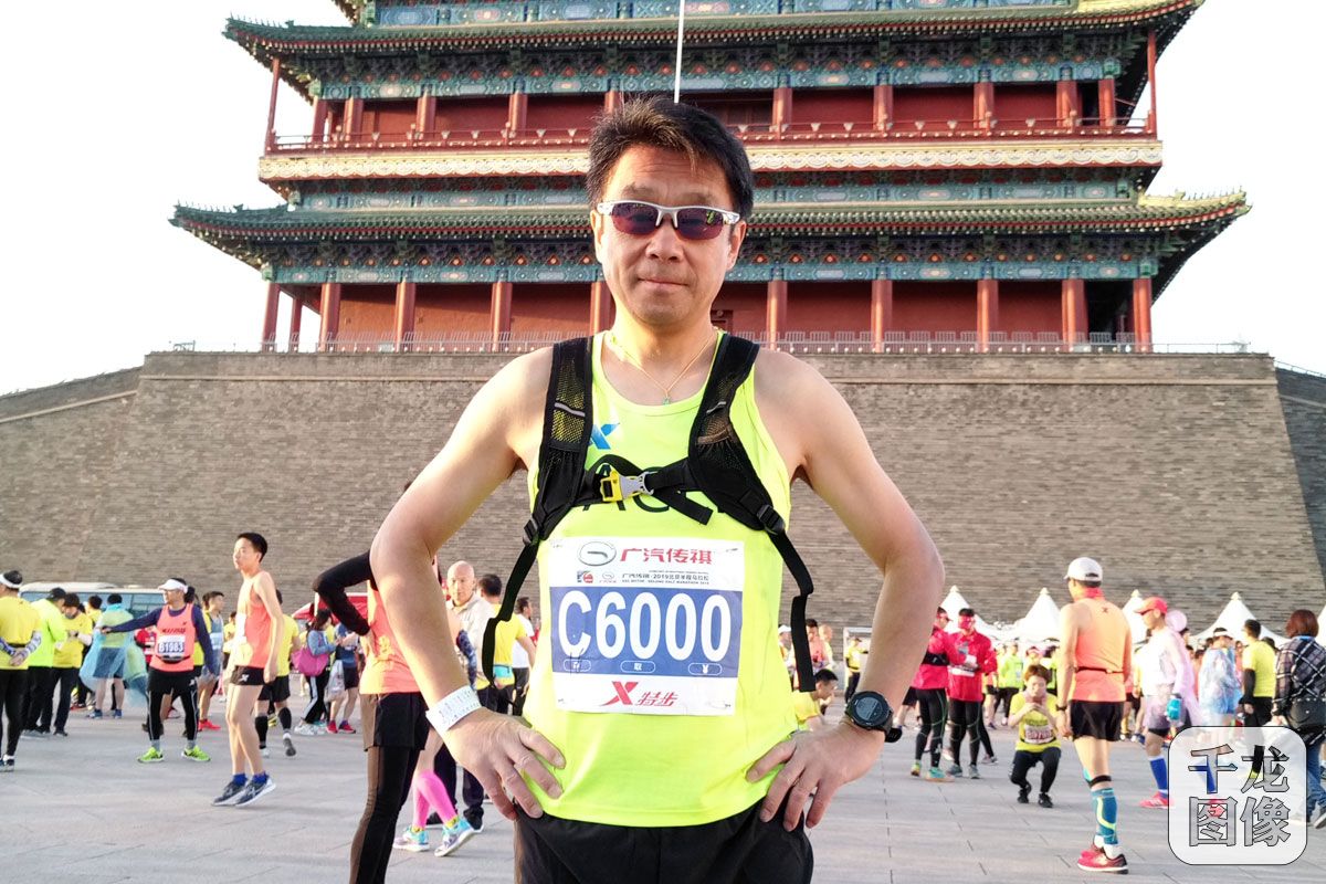 4月14日,广汽传祺·2019北京国际长跑节-北京半程马拉松天安门广场鸣枪起跑,图为北京半程马拉松2小时15分官方领跑员来健在起点准备进场。千龙网记者 黄业摄
