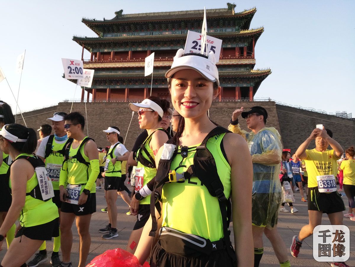 4月14日,广汽传祺·2019北京国际长跑节-北京半程马拉松天安门广场鸣枪起跑,图为北京半程马拉松2小时15分官方领跑员陈丹妮在起点准备进场。千龙网记者 黄业摄