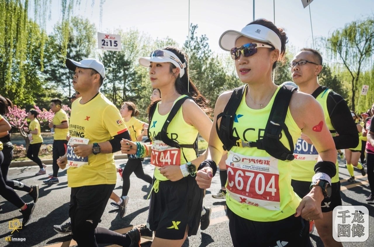 4月14日,广汽传祺·2019北京国际长跑节-北京半程马拉松天安门广场鸣枪起跑,图为北京半程马拉松2小时15分官方领跑员董的(右二)和贾炜(右一)在比赛中。千龙网发 赛事组委会供图 轲影像拍摄