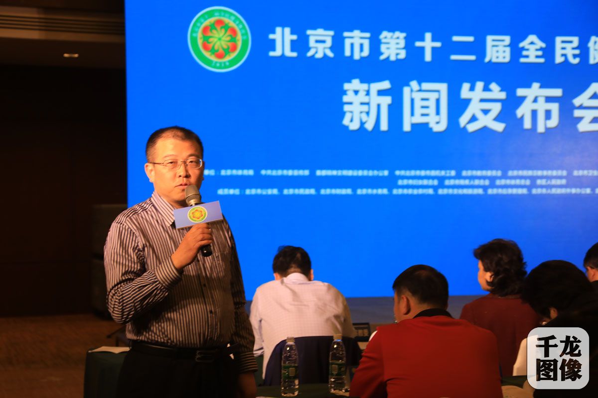4月16日,北京市第十二届全民健身体育节新闻发布会举行。图为东城区体育局副局长张庆春回答记者提问。千龙网记者 戚连民摄