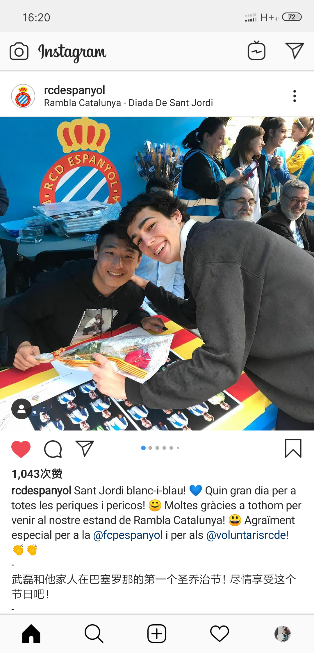 入乡随俗的武磊,今天也随西班牙人一起参加了圣乔治节的庆祝活动。球队的官方ins发布了一张武磊和球迷的合影,并配文道:“武磊和他家人在巴塞罗那的第一个圣乔治节!尽情享受这个节日吧!”现场气氛十分热闹,球员们和球迷一同庆祝当地的传统节日,让球迷可以近距离接触喜欢的球星。