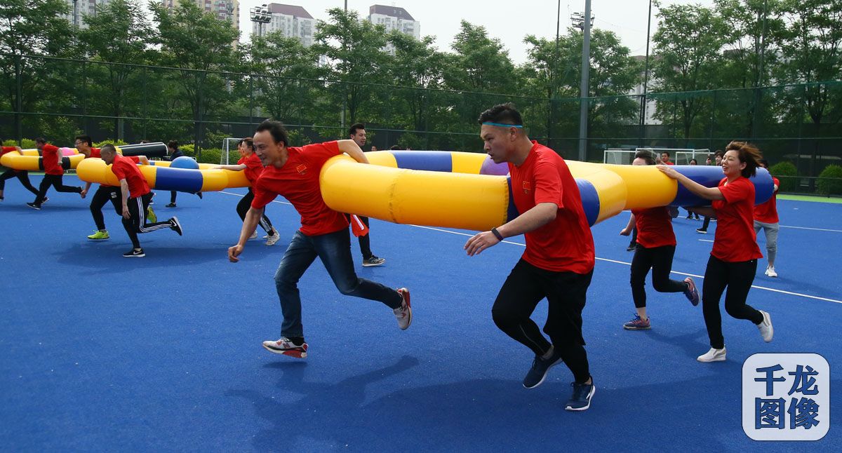 5月8日,一年一度的“国家奥林匹克体育中心来京建设者趣味健身活动”在国家奥林匹克体育中心举行。图为集体抬球比赛。千龙网记者 戚连民摄