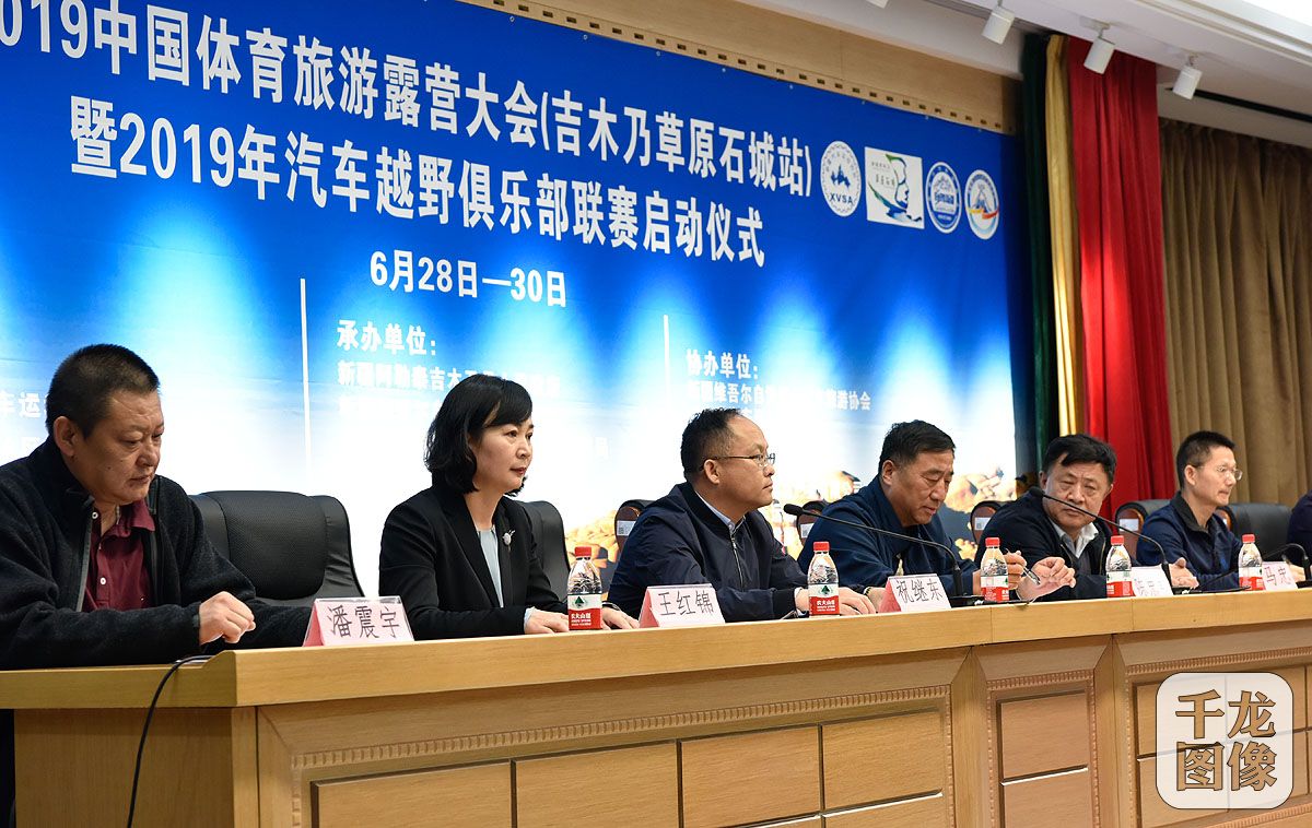 5月17日,“大美新疆”2019中国体育旅游露营大会暨中国汽车越野俱乐部联赛(吉木乃草原石城站)启动仪式在新疆体育中心举行,本次联赛将于 6月底在新疆阿勒泰吉木乃县拉开帷幕。图为启动仪式现场。千龙网发 中国登山协会供图