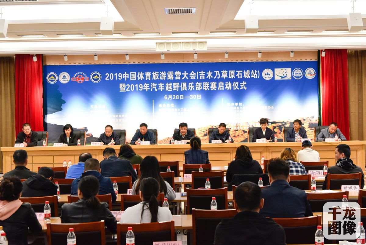 5月17日,“大美新疆”2019中国体育旅游露营大会暨中国汽车越野俱乐部联赛(吉木乃草原石城站)启动仪式在新疆体育中心举行,本次联赛将于 6月底在新疆阿勒泰吉木乃县拉开帷幕。图为启动仪式现场。千龙网发 中国登山协会供图