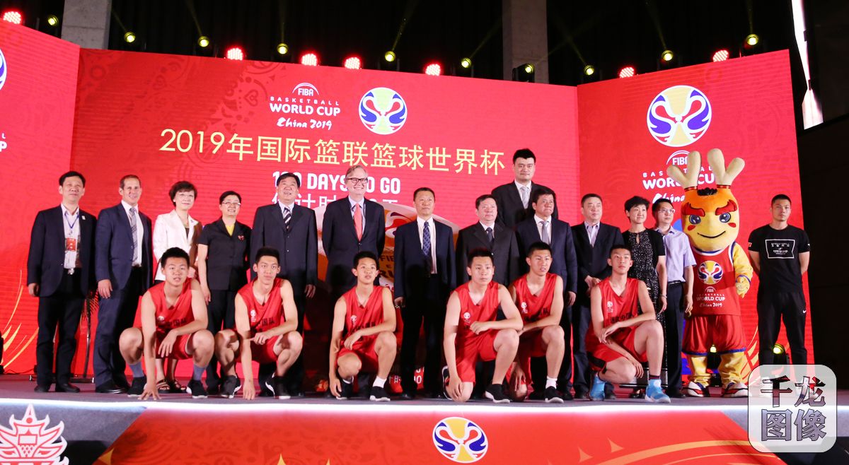 5月23日,2019年国际篮联篮球世界杯倒计时100天启动仪式在北京五棵松HI-Park多功能厅隆重举行。图为与会嘉宾和小球员集体合影。千龙网记者 戚连民摄