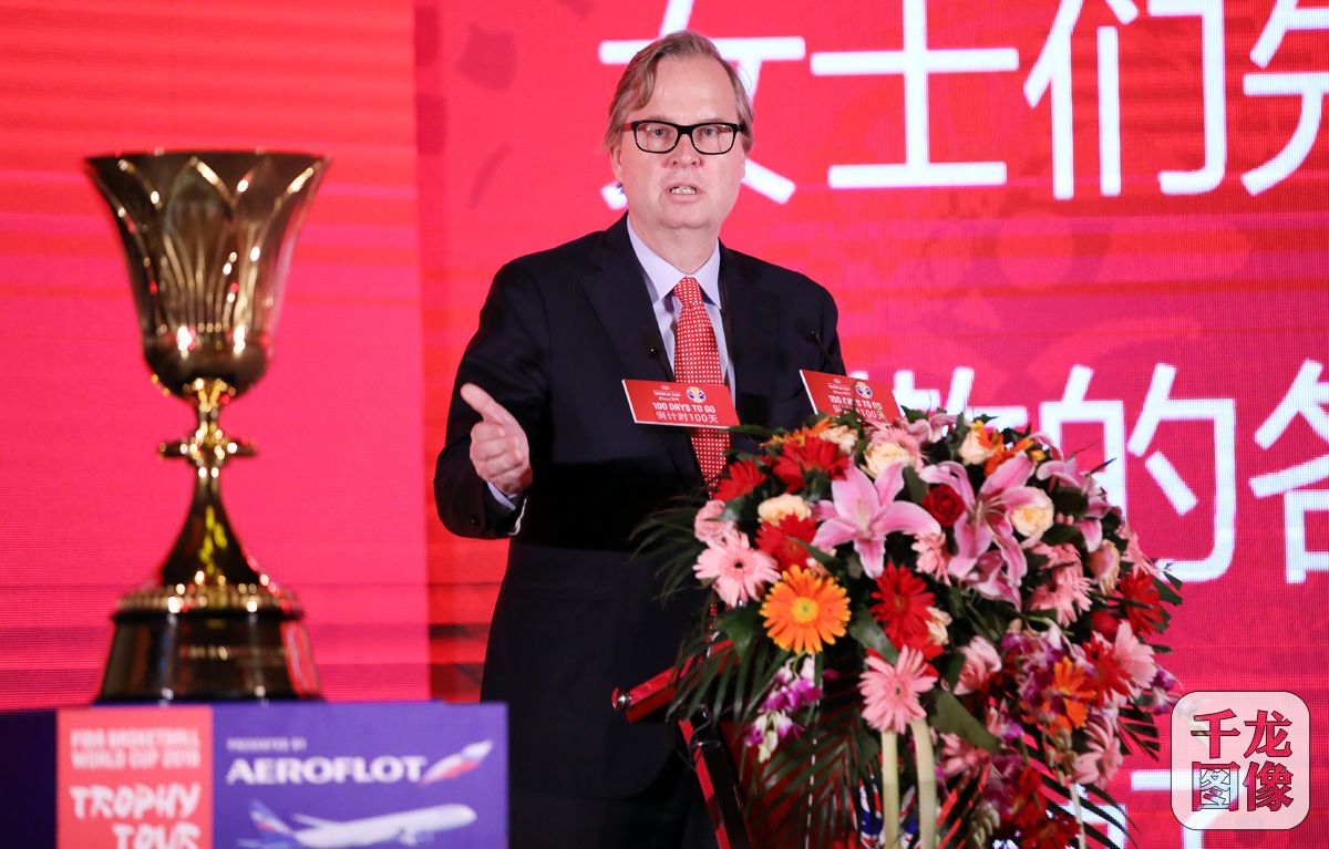 5月23日,2019年国际篮联篮球世界杯倒计时100天启动仪式在北京五棵松HI-Park多功能厅隆重举行。图为国际篮联代表弗兰克·林德斯致辞。千龙网记者 戚连民摄