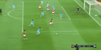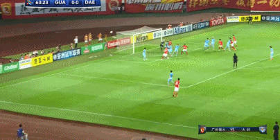 第53分钟李学鹏左路将球传出,这时在大禁区前的黄博文将皮球吊到禁区内,恒大在后点形成两点包抄的态势,杨立瑜抢到落点甩头攻门稍稍顶偏。