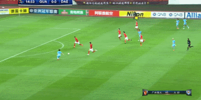 第14分钟大邱后场快发任意球,连续一脚传递,金大元在大禁区前得到皮球,面对积极回防的张琳芃,他巧妙一扣闪开空当,随后他的大力抽射稍稍打偏。