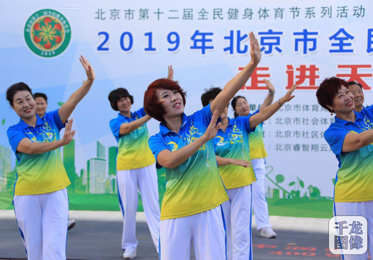 5月28日,第十二届全民健身体育节系列活动、乐享生活“回天地区”全民健身系列活动——2019年北京市全民健身与营养社区行启动仪式在天通东苑第三社区举行。活动旨在普及健身知识、优化健康服务、传播营健身营养相结合的理念,让全民健身与营养融入群众日常生活,使“全民健身计划”逐步上升为“全民幸福计划”,巩固和提升社区体育工作水平,推动回天地区全民健身全面发展,切实增强回天地区广大居民的幸福感、获得感。图为启动仪式上健身操展示。千龙网发 大胡摄
