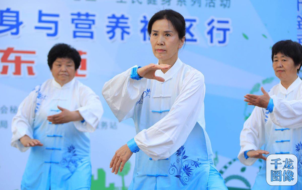 5月28日,第十二届全民健身体育节系列活动、乐享生活“回天地区”全民健身系列活动——2019年北京市全民健身与营养社区行启动仪式在天通东苑第三社区举行。活动旨在普及健身知识、优化健康服务、传播营健身营养相结合的理念,让全民健身与营养融入群众日常生活,使“全民健身计划”逐步上升为“全民幸福计划”,巩固和提升社区体育工作水平,推动回天地区全民健身全面发展,切实增强回天地区广大居民的幸福感、获得感。图为启动仪式上太极展示。千龙网发 大胡摄