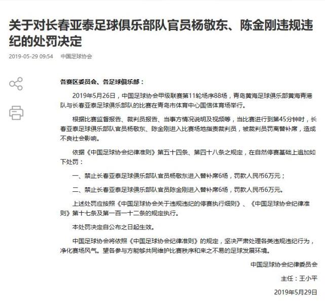 依据《中国足球协会纪律准则》第五十四条、第四十八条之规定,两人在自然停赛基础上被追加处罚:一、禁止长春亚泰足球俱乐部队官员杨敬东进入替补席6场,罚款人民币6万元;二、禁止长春亚泰足球俱乐部队官员陈金刚进入替补席6场,罚款人民币6万元。