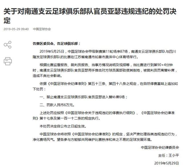 另外在冲突中,南通支云俱乐部队外籍助教亚瑟用手推击对方球员陈涛面部致使其倒地,被裁判员罚离替补席,依据《中国足球协会纪律准则》第五十三条、第四十八条之规定,助教亚瑟在自然停赛基础上被追加处罚:一、禁止南通支云足球俱乐部队官员亚瑟进入替补席6场;二、罚款人民币6万元。