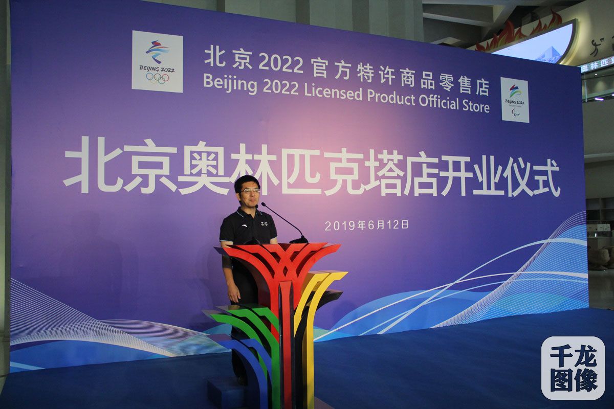 6月12日,北京2022官方特许商品零售店(北京奥林匹克塔店)开业。图为北京冬奥组委市场开发部副部长王禹致辞。千龙网记者 黄业摄