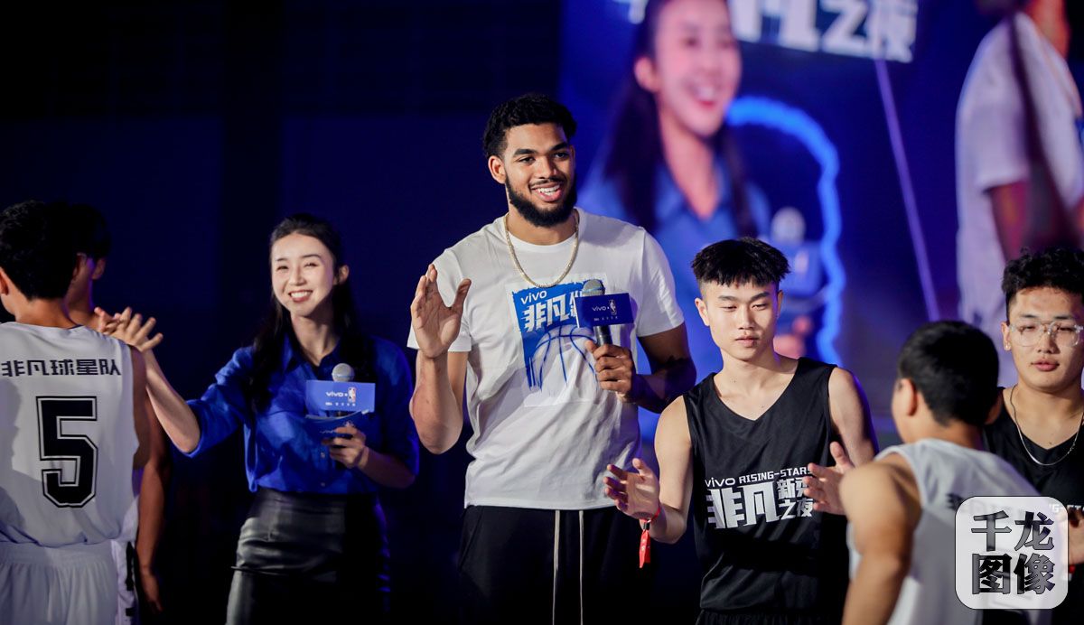 6月15,NBA球星卡尔-安东尼·唐斯亲临北京科技大学篮球馆,亮相vivo非凡新秀赛 · 新秀之夜活动现场。图为唐斯与全场粉丝互动。千龙网发 主办方供图
