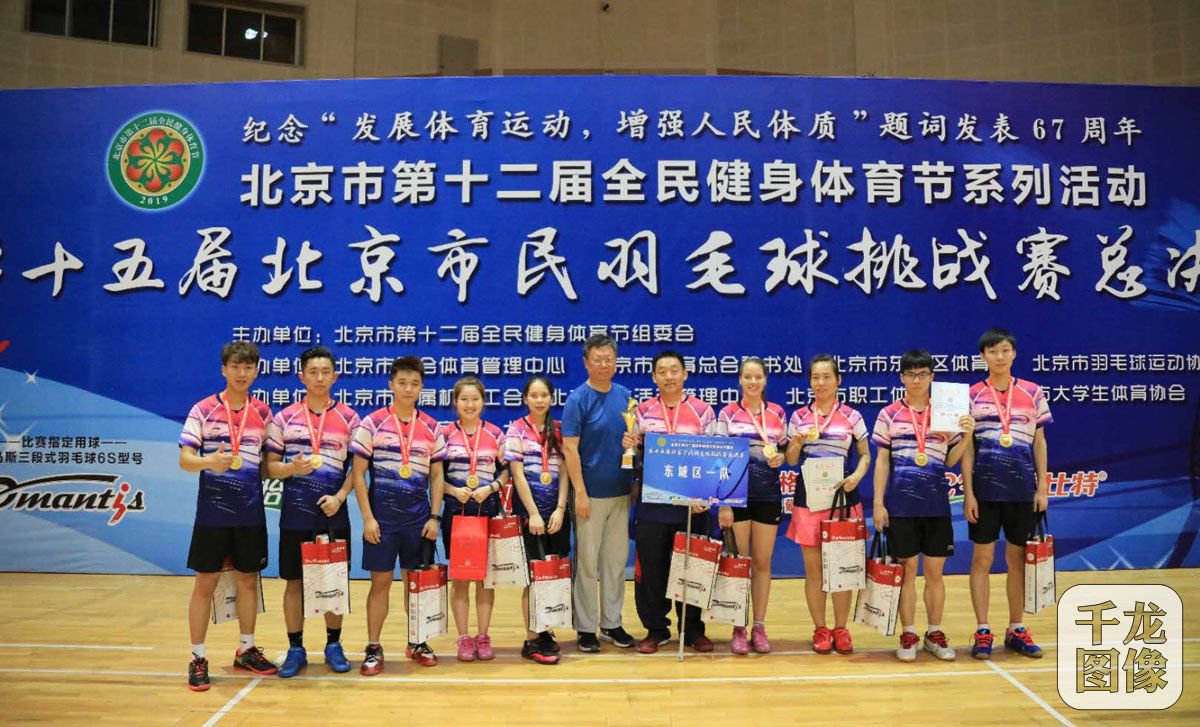 6月15日-16日,北京市第十二届全民健身体育节系列活动—第十五届北京市民羽毛球挑战赛总决赛在地坛体育馆举行。共有67支代表队、近1000名运动员在赛场上强强对决尽展风采。图为北京市体育局副局长杨海滨为获奖队伍颁奖。千龙网发 大胡摄
