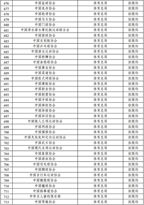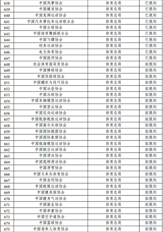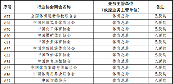 日前,国家发改委官网发布《关于全面推开行业协会商会与行政机关脱钩改革的实施意见》,列入脱钩名单的全国性行业协会商会共795家,已脱钩422家,拟脱钩373家。其中体育总局主管的89家协会商会,已脱钩的21家,拟脱钩的68家。