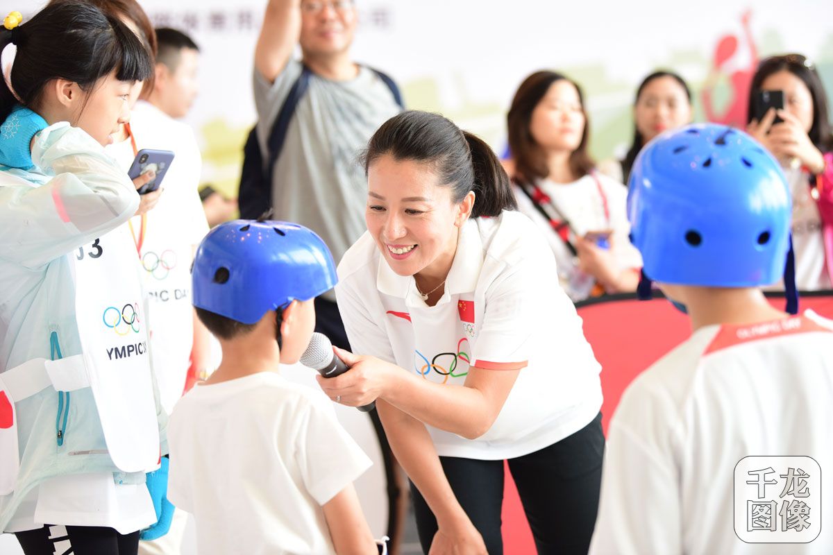 6月23日上午9时,中国奥委会2019年第33届奥林匹克日活动在北京、张家口、上海、广州、青岛、承德、海阳、十堰、鞍山、宁蒗等10地同步启动。图为奥运冠军杨扬在会场参加活动。千龙网发 中国奥委会供图