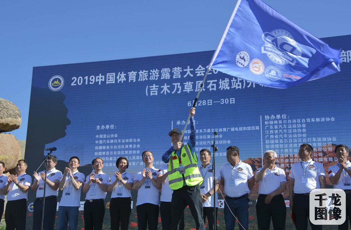 6月29日,“大美新疆”2019中国体育旅游露营大会在新疆吉木乃县草原石城景区举行。本届大会共设竞技体育、大众健身和表演娱乐等三大类体育项目为广大户外运动爱好者提供了更多选择。图为开幕式现场。千龙网发 主办方供图