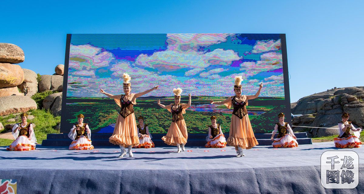 6月29日,“大美新疆”2019中国体育旅游露营大会在新疆吉木乃县草原石城景区举行。本届大会共设竞技体育、大众健身和表演娱乐等三大类体育项目为广大户外运动爱好者提供了更多选择。图为开幕式歌舞表演。千龙网发 主办方供图