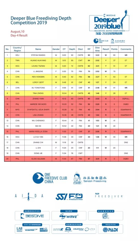 因为罕见的四台风天气影响,我们的比赛一波三折终于顺利结束。7号的下潜因天气原因,海岸警卫队发布消息全岛禁止出海,不得不取消。8日的比赛,在2名选手完成下潜的情况下,因为天气恶劣主裁延后了比赛,下午风浪依旧很大,为了安全起见,主裁取消了当日比赛。翘首以盼的选手终于等来了9日的正常比赛,大部分选手取得了满意成绩,当日创造了4项国家或地区纪录。2019年DeeperBlue正赛于9日结束并在当晚颁奖;但许多选手因天气影响略有遗憾,赛事主办方特意向AIDA官方说明情况并申请将10号作为附加赛,所有成绩和纪录计入AIDA成绩排名,得到AIDA国际批准。10号附加赛中,中国选手徐童彤打破CNF项目的国家女子记录;STEFAN以90米的双蹼成绩再次刷新自己9号创造的85米德国国家纪录、LO KA YAN创造了新的香港地区纪录,小白兔等选手也于10号创造出自己的最好成绩。