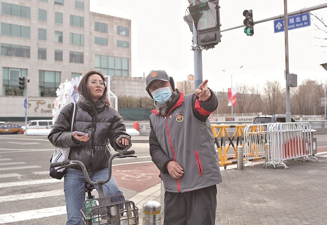 北辰西路和安翔北路交叉口,志愿者正在给游客指路。新京报记者 王飞 摄