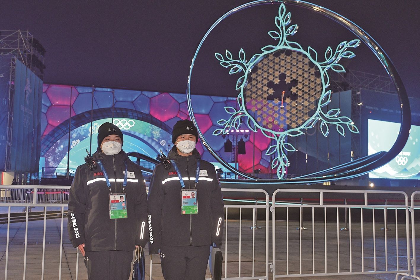 消防安保团队工作人员守护北京冬奥会火炬台。新京报记者 王飞 摄