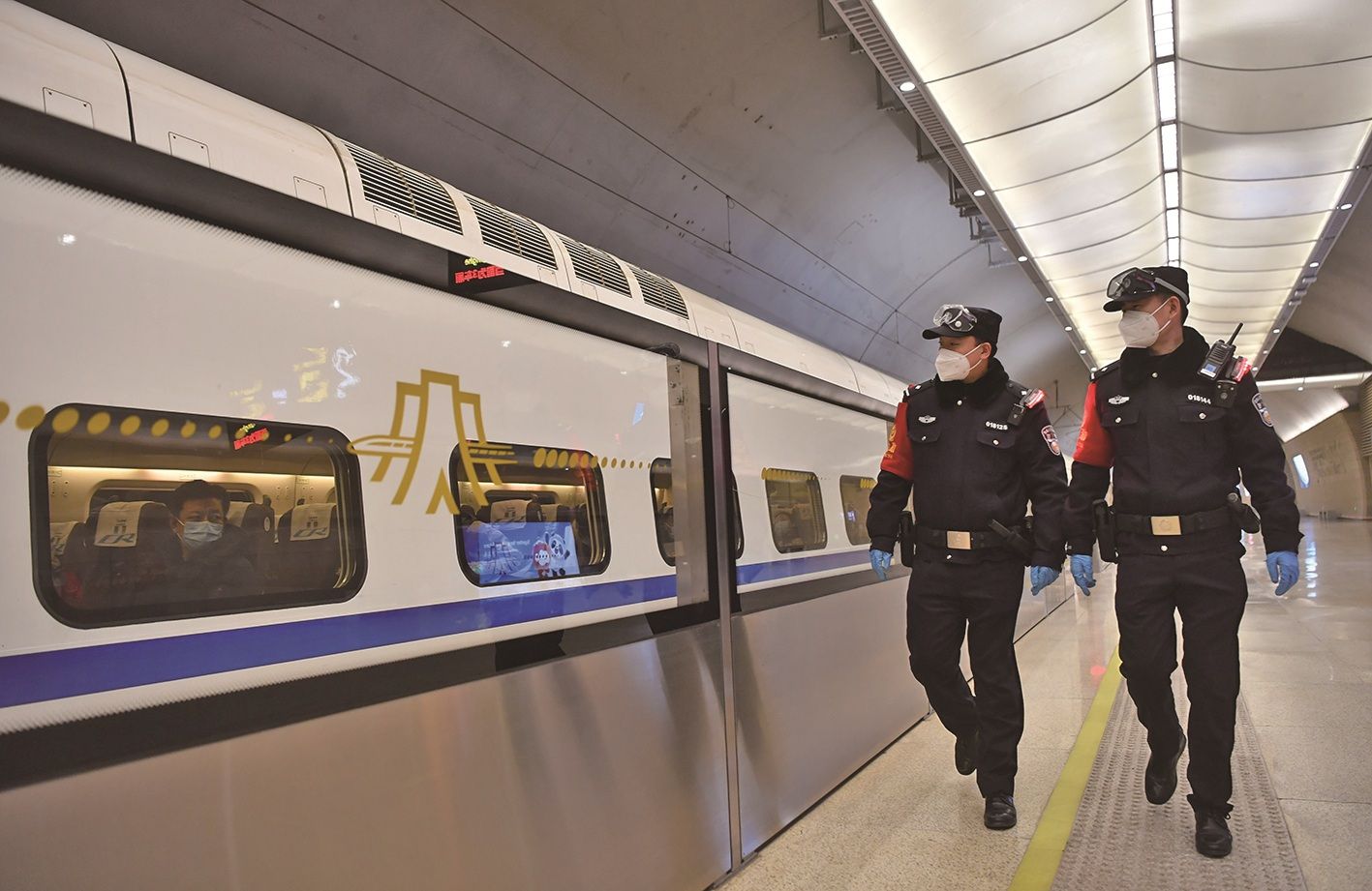 八达岭长城站,京张高铁铁警进行站内执勤,守护冬奥列车。新京报记者 李木易 摄
