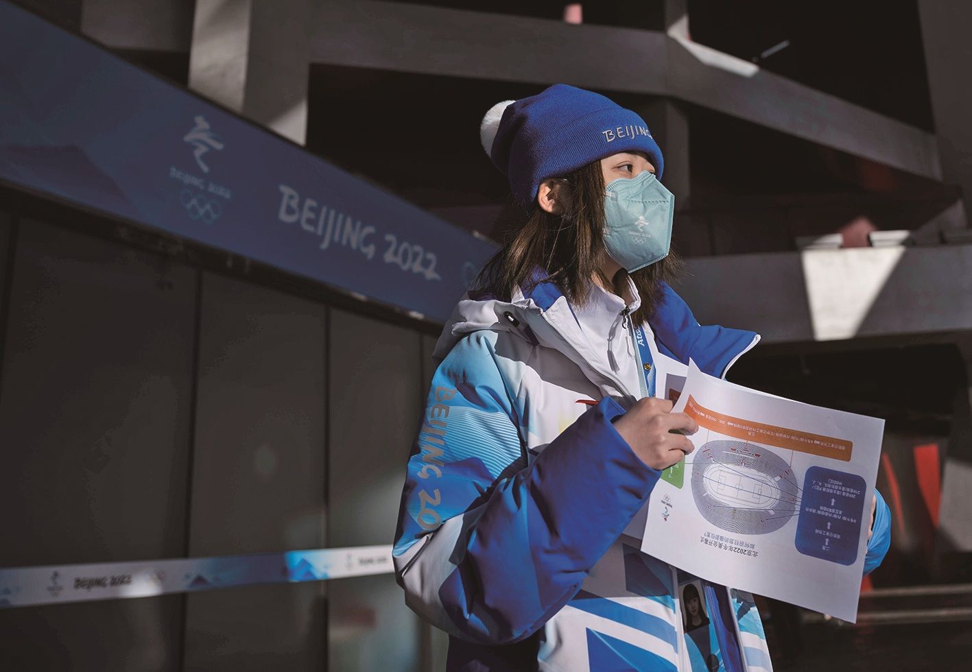 国家体育场“鸟巢”,志愿者为参加开幕式的记者提供指引。新京报记者 陶冉 摄