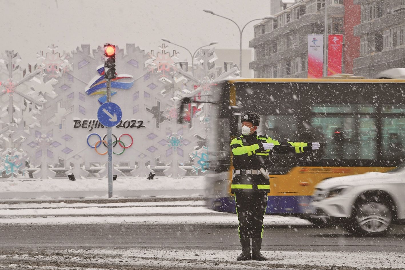 安翔北路东口,民警正在执勤,确保“冰立方”赛场重要通道畅通。新京报记者 王贵彬 摄