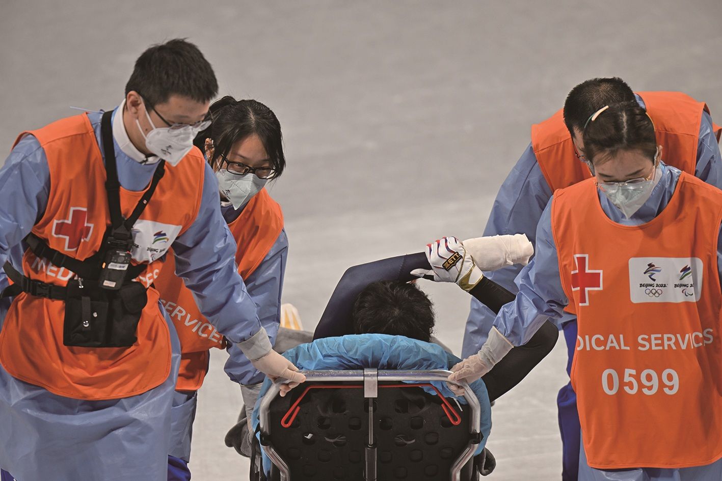 首都体育馆,医疗团队及时进场救治摔倒的运动员。新京报记者 陶冉 摄