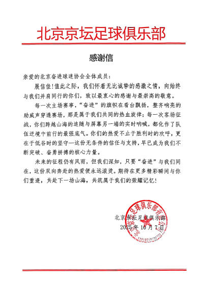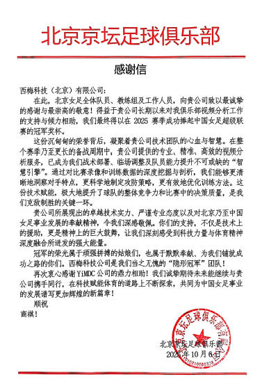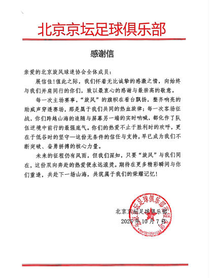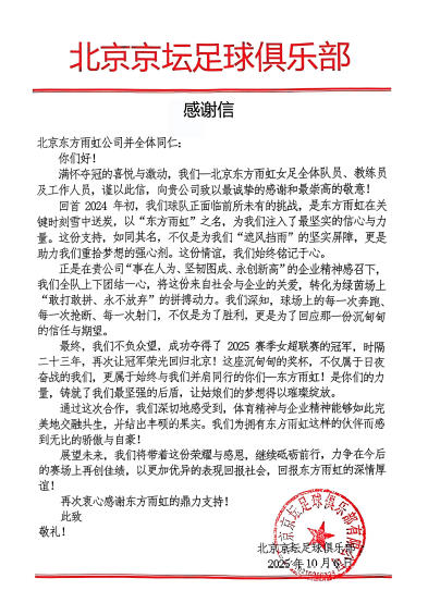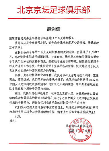 10月6日,刚刚夺得2025赛季女超联赛冠军的北京女足向北京东方雨虹公司、国家体育总局秦皇岛体育训练基地(中国足球学校)、西梅科技(北京)有限公司以及“奋进”“旋风”两大球迷协会发出感谢信。
