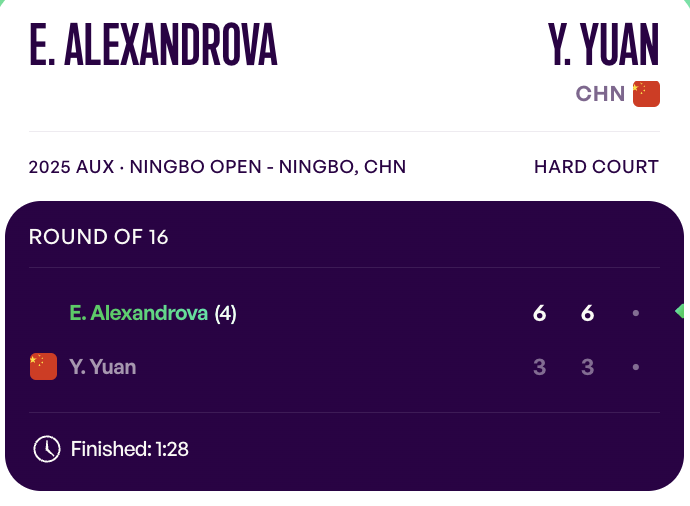 本场较量一上来,亚历山德洛娃表现得很强势,她率先完成破发。回到自己的发球局,亚历山德洛娃又依靠火热的手感连续轰出ACE球,凭借超过80%一发得分率,以6比3先下一城。第二盘,袁悦依然没能扭转被动局面。来到盘末个人非报不可的发球局,袁悦努力挽救多个破发点,还是被对手兑现赛点,最终两盘不敌对手,就此止步。