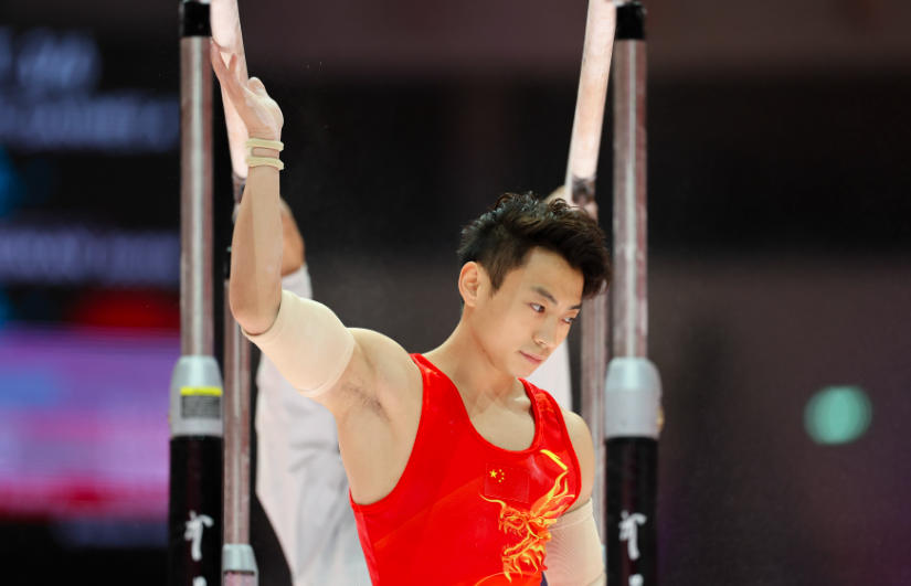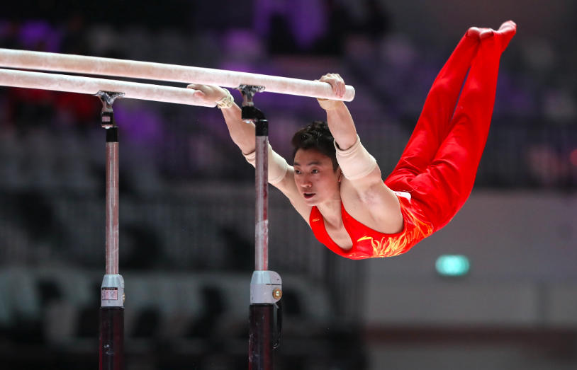 此前的资格赛,邹敬园参加双杠项目的角逐。图片来源:新华社