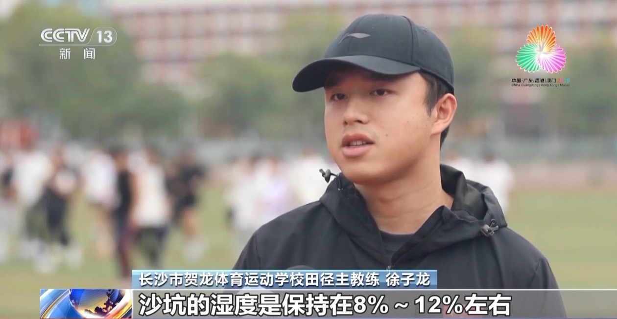 长沙市贺龙体育运动学校田径主教练 徐子龙:沙坑的湿度保持在8%~12%左右。如果沙坑湿度较高,它就会像水泥一样板硬,对运动员是一种伤害。