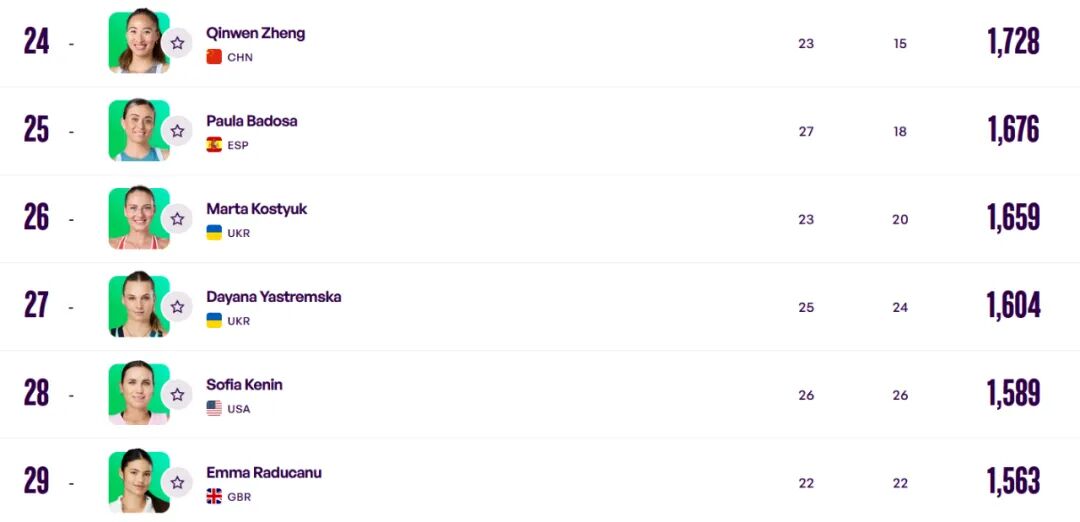 在最近一期WTA女单排名中,郑钦文位列世界第24。
