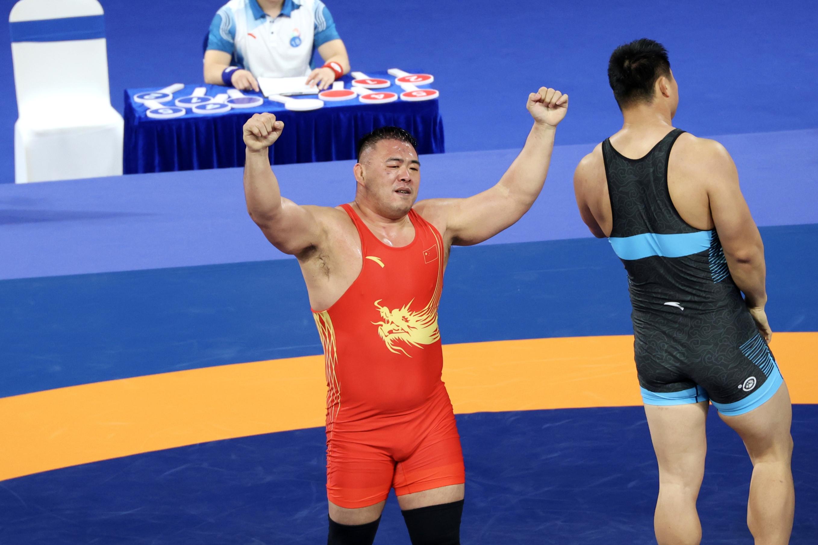 11月12日,十五运会男子自由式摔跤125公斤级决赛在清远体育中心体育馆进行。北京队老将邓志伟发挥出色,击败山西队选手胡展翔,实现全运会该项目三连冠。