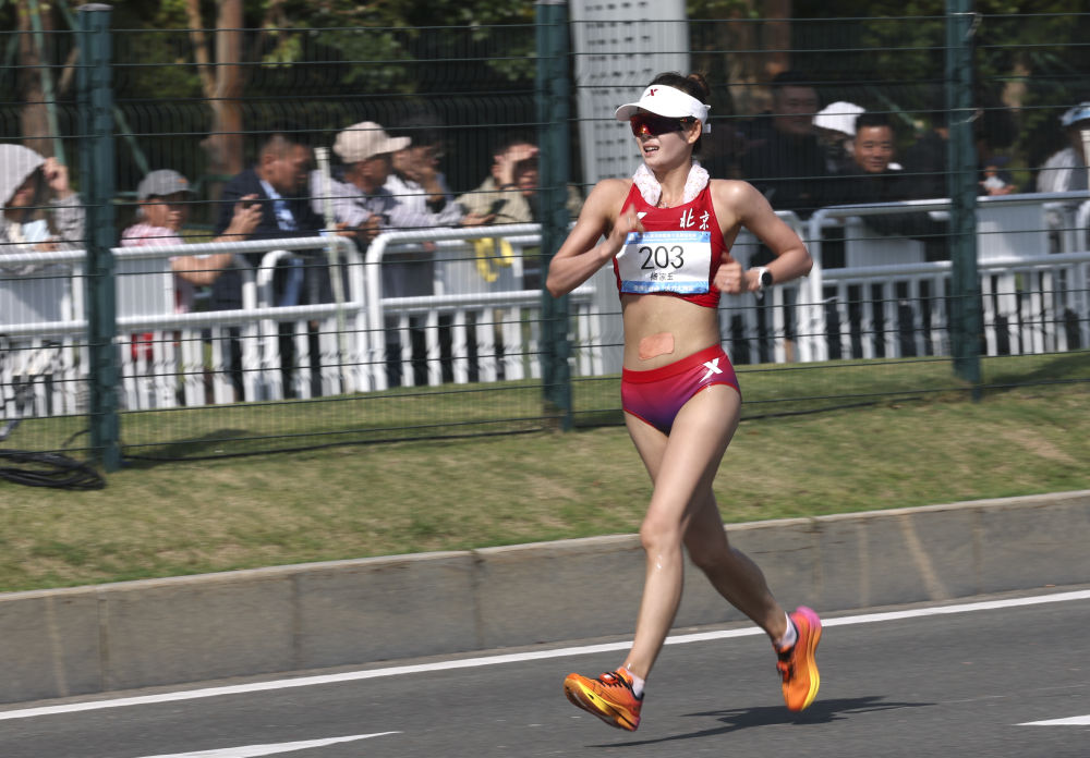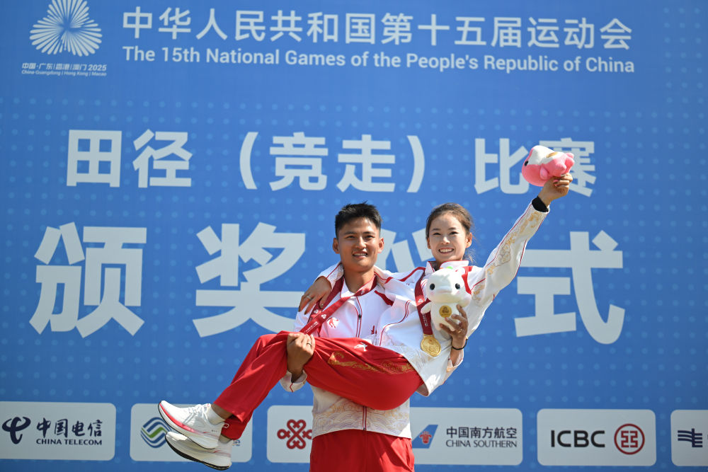 12日中午,第十五届全国运动会女子20公里竞走颁奖仪式上,播报员声音激昂。