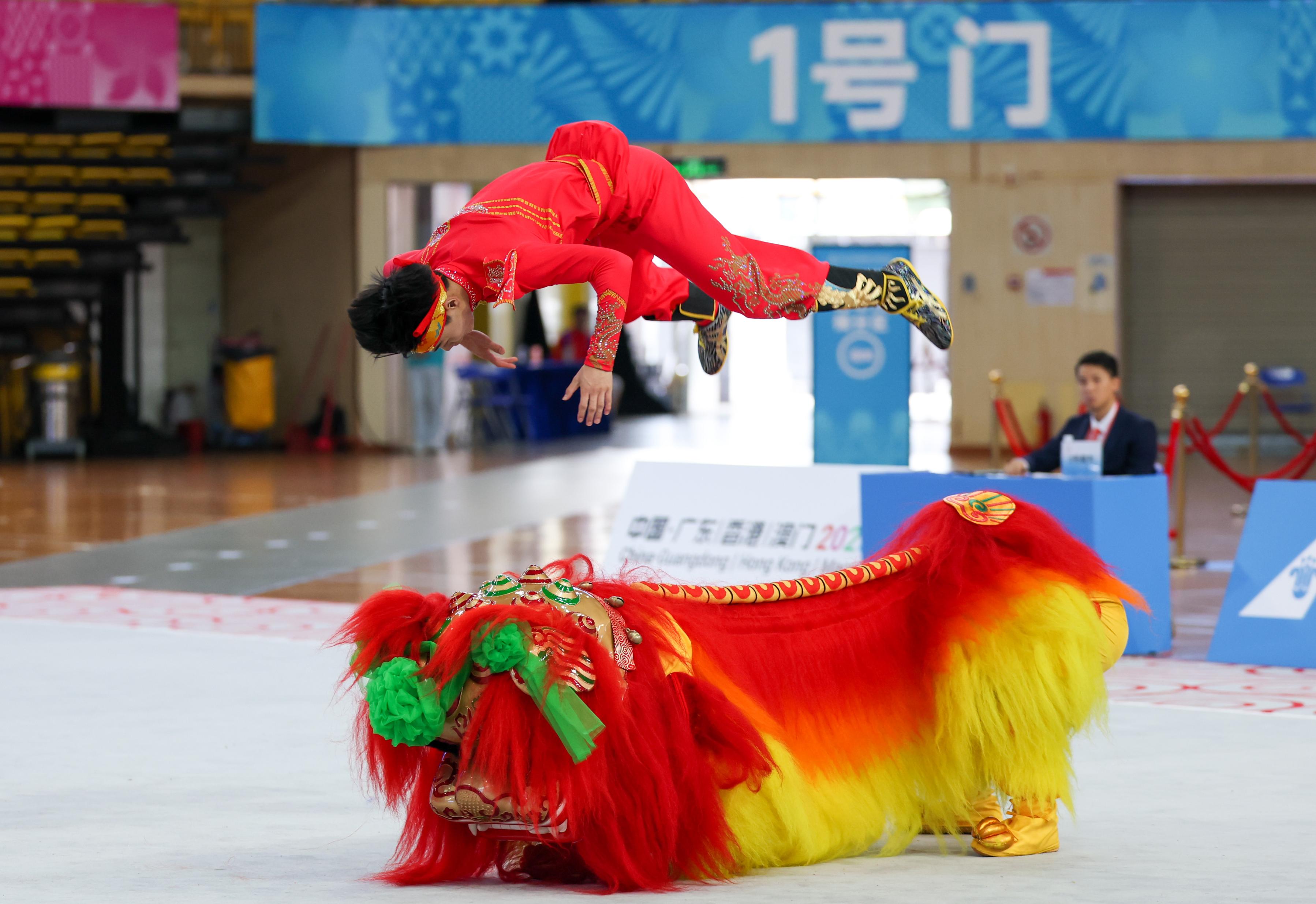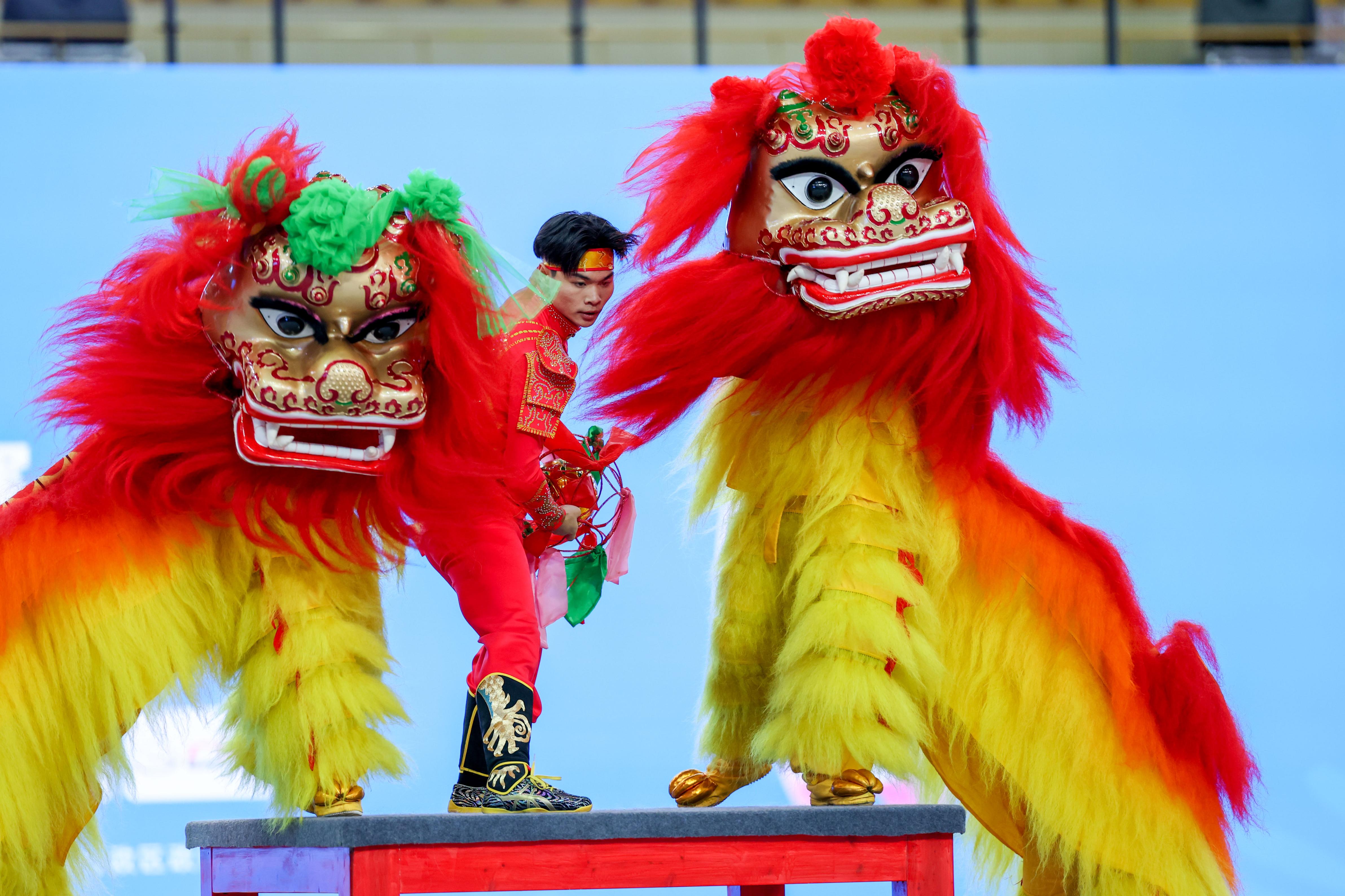 两只狮子外,每支队伍还有一名“引狮员”,他不仅要引导狮子的动作,还要独立完成翻跟头等难度动作。