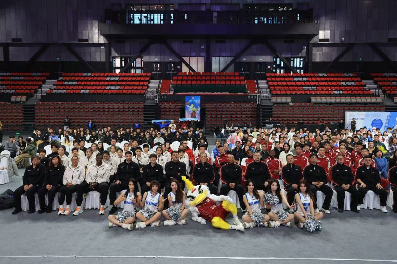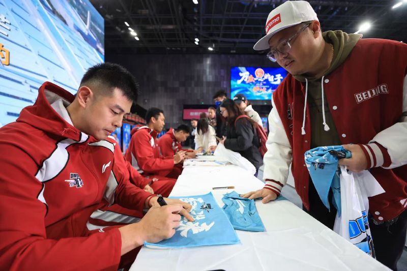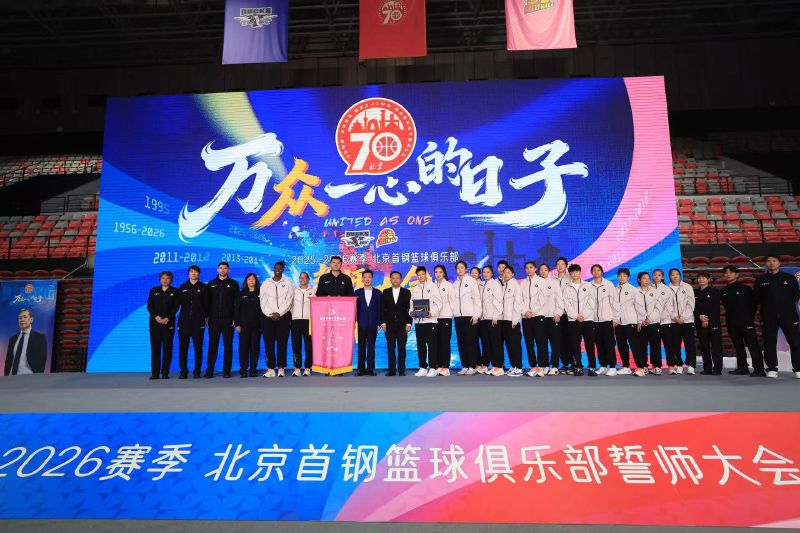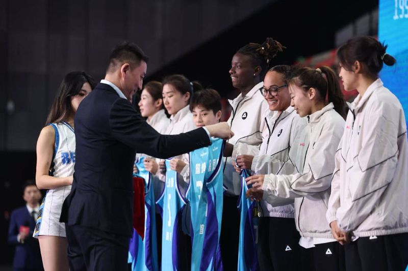 11月18日,2025-2026赛季北京首钢篮球俱乐部誓师大会在北京首钢冰球馆举行。本赛季,北京首钢大家庭迎来一批新鲜血液——北京北汽男篮新球员赵睿、李永瀚、张知垚、斯佩尔曼,北京首钢园女篮潘臻琦、李一凡、冯可心、王小青、徐凤威、豆中秋、凯·詹姆斯、蒂芙尼·米切尔、米娅·洛伊德。在誓师大会上,这些新面孔从俱乐部总经理张云松手中接过新赛季球衣,宣告着北京男女篮已经集结完毕,将一起迎接新挑战,开启新征程。图为女篮球员接过新赛季的球衣。