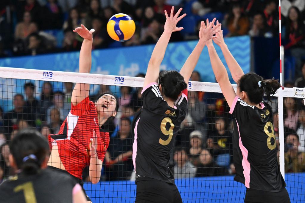 11月18日,江苏队球员范泊宁(右一)在比赛中进攻。新华社记者 陈钟昊 摄